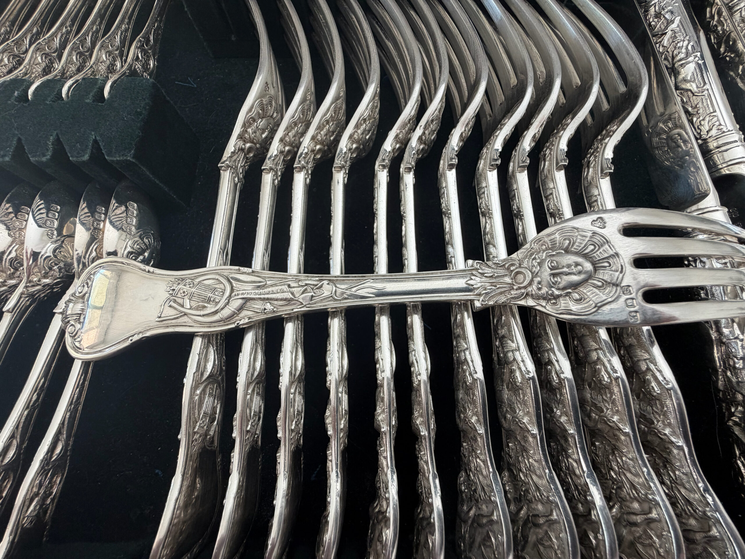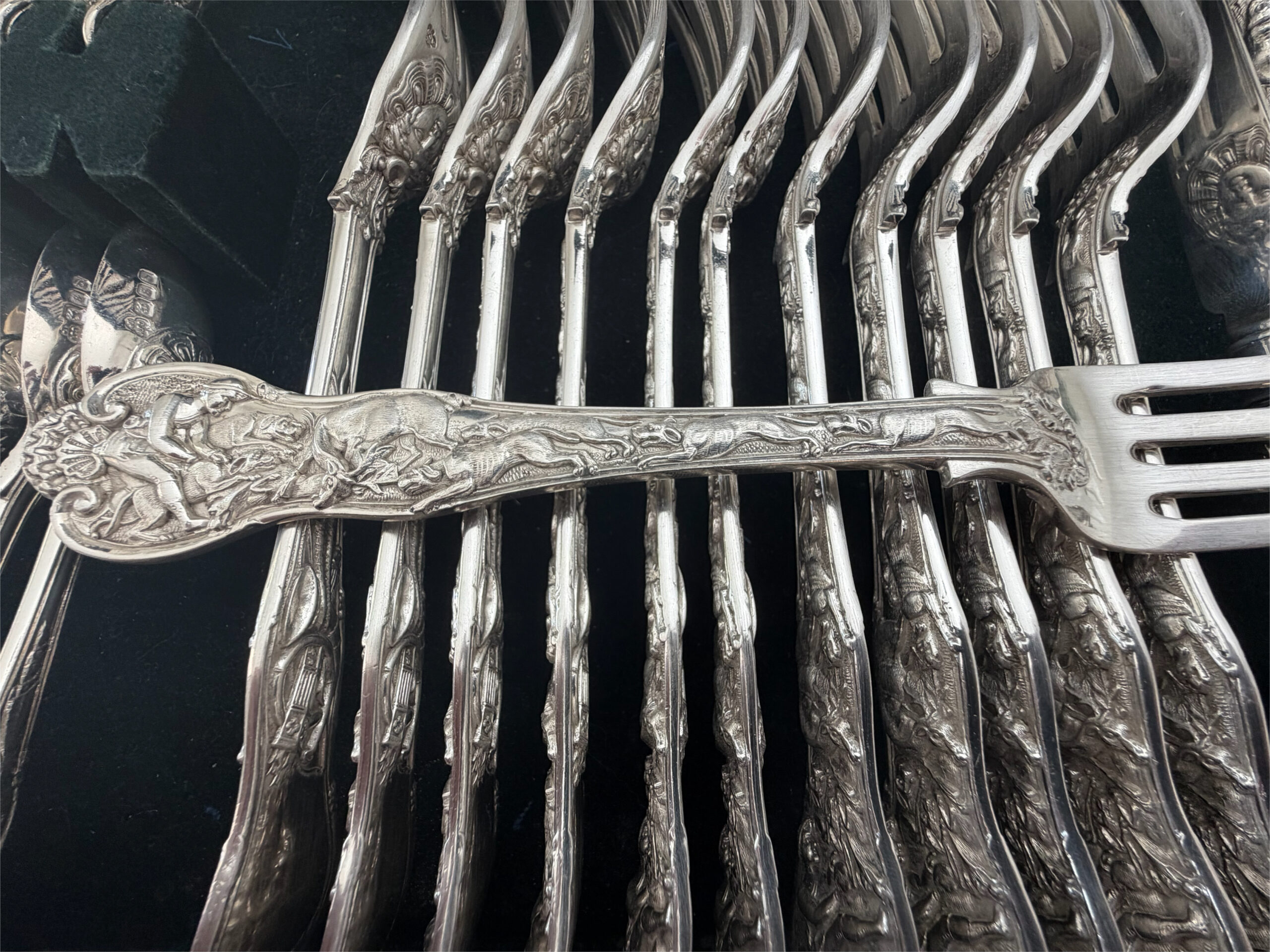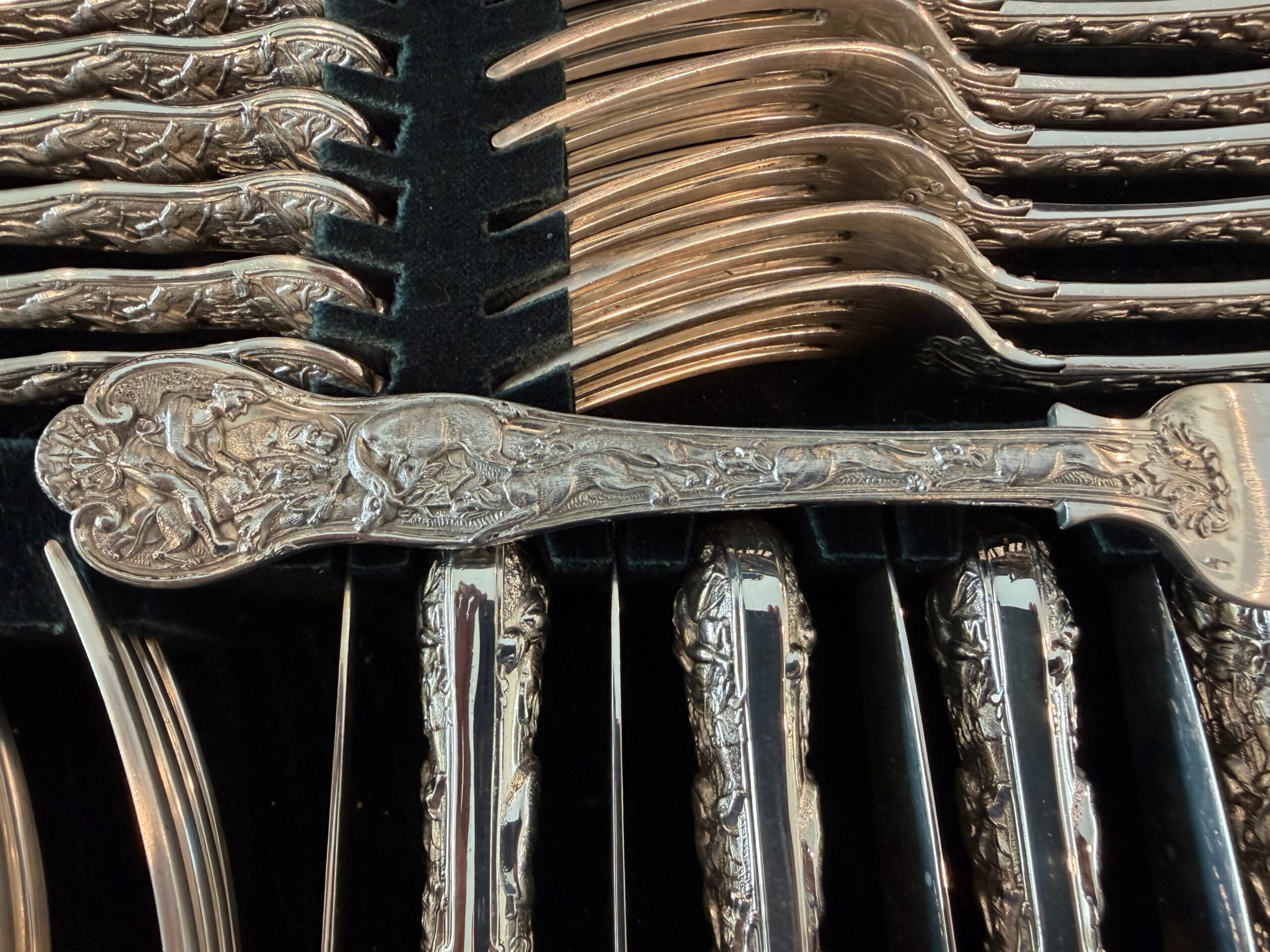 The original Stag Hunt pattern was made by Paul Storr, who founded the firm Hunt and Roskell. He was a master goldsmith and silversmith who designed and produced flatware and sculptures for royalty, including Queen Victoria, from 1783 to 1838, before retiring. His partnership with Rundell, Bridge & Rundell from 1807 to 1819 made him an elite, highly sought-after master craftsman. https://www.britannica.com/biography/Paul-Storr